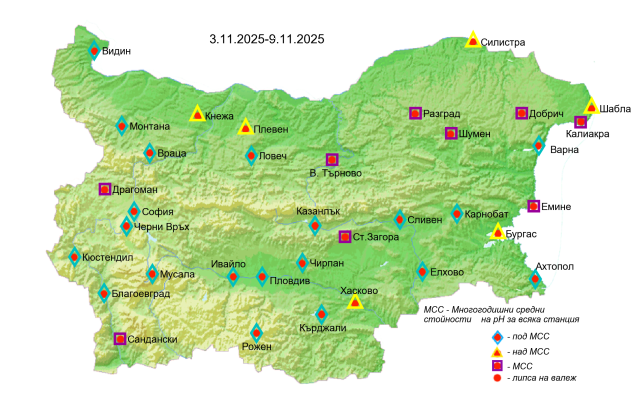Картата на киселинността на валежите се публикува, ако е имало валежи.