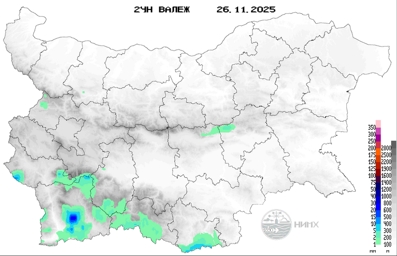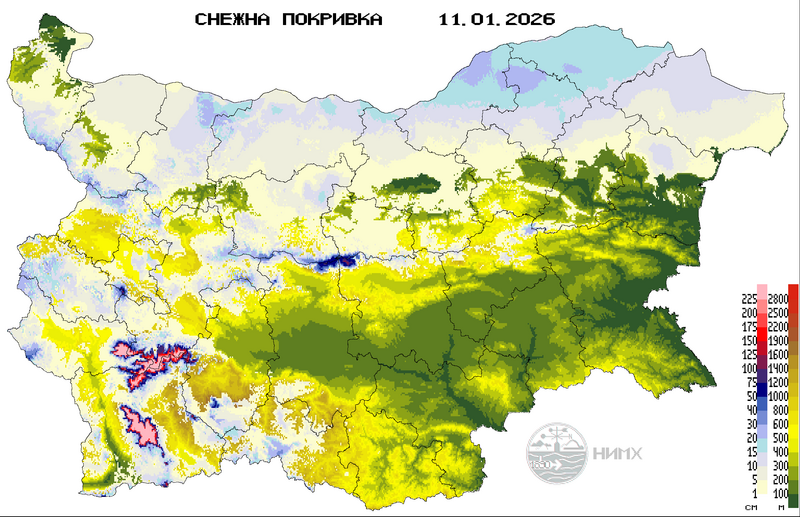 Височина на снежната покривка по данни от станциите на НИМХ към 7.30 ч на датата, посочена на картата. Обновява се веднъж дневно към 12 ч. Лява скала — снежна покривка в сантиметри. Дясна скала — надморска височина в метри за местата без снежна покривка.