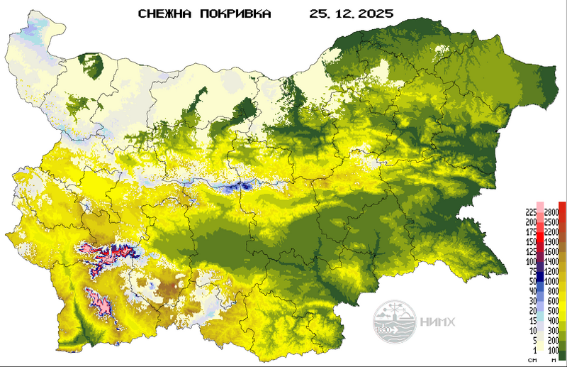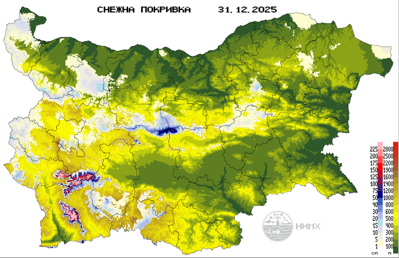 Височина на снежната покривка по данни от станциите на НИМХ към 7.30 ч на датата, посочена на картата. Обновява се веднъж дневно към 12 ч. Лява скала — снежна покривка в сантиметри. Дясна скала — надморска височина в метри за местата без снежна покривка.