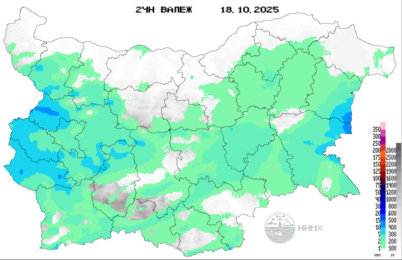 Денонощната сума на валежа от 8 ч. на предния ден до 8 ч. на датата, посочена на картата, по данни от станциите на НИМХ. Обновява се веднъж дневно към 12 ч.