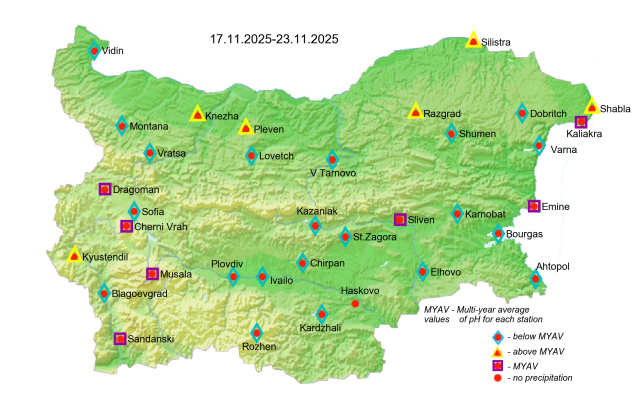 This map of precipitation acidity is issued every week if there was any precipitation.