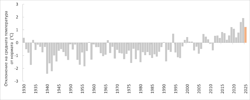 Изминалата 2025 г. е поредната топла година за България от началото на XXI век, със средна температура за страната около 1.2 градуса по Целзий (°С) над климатичните норми*. Тя е толкова топла, колкото и 2019 г., и е с около 0.8 °С градуса по-студена от рекордната 2024 г. Характеризира се с горещо лято, третото най-топло – след лятото на 2024 и 2012 г., от 1930 г. насам. През зимата, пролетта и есента средните сезонни температури също са над климатичните норми, но със значително по-малки положителни отклонения. Месеците със средни температури на въздуха под климатичните норми за 2025 г. са февруари (минус 2.4 °С под нормата), април (минус 0.3 °С), май (минус 1.0 °С) и октомври (минус 1.1 °С).