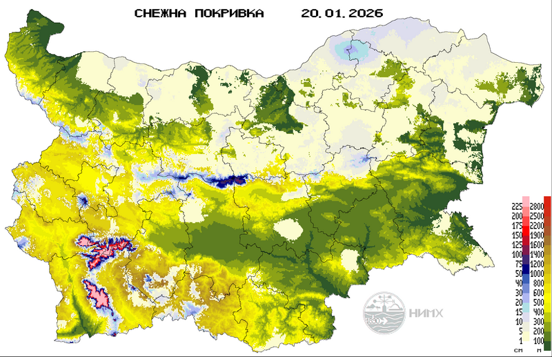 Височина на снежната покривка по данни от станциите на НИМХ към 7.30 ч на датата, посочена на картата. Обновява се веднъж дневно към 12 ч. Лява скала — снежна покривка в сантиметри. Дясна скала — надморска височина в метри за местата без снежна покривка.